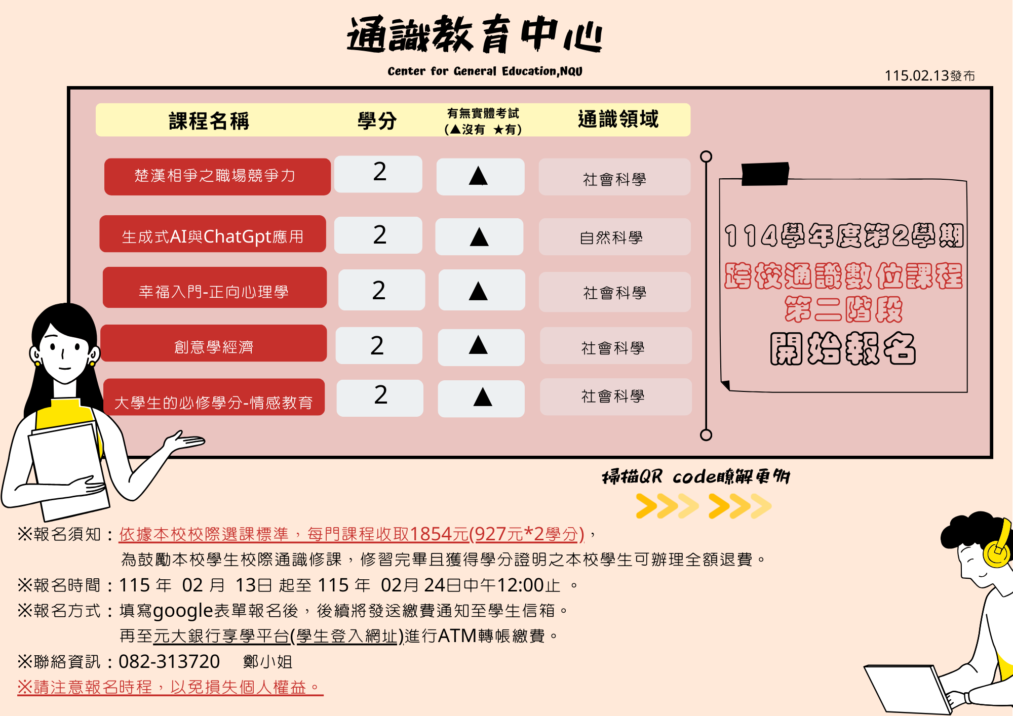 本校114學年度第2學期【跨校通識數位課程】第二階段開始報名囉!